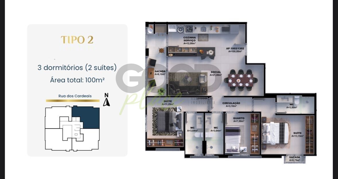 Apartamento com 100m² de 03 (três) dormitórios, sendo 02 (duas) suítes, sala, cozinha/área de serviço, sacada, BWC e 01 (uma) vaga de garagem (Conforme projeto arquitetônico).